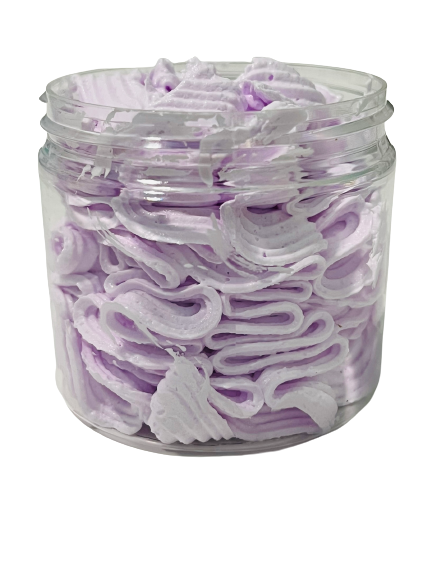 A fluffy, semi-solid, whipped sugar scrub in a beautiful pastel purple, scented in our Bedtime Baby fragrance oil. Contains Shea Butter and Grapeseed Oil